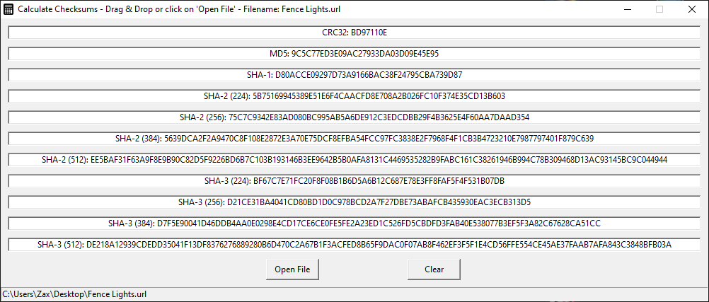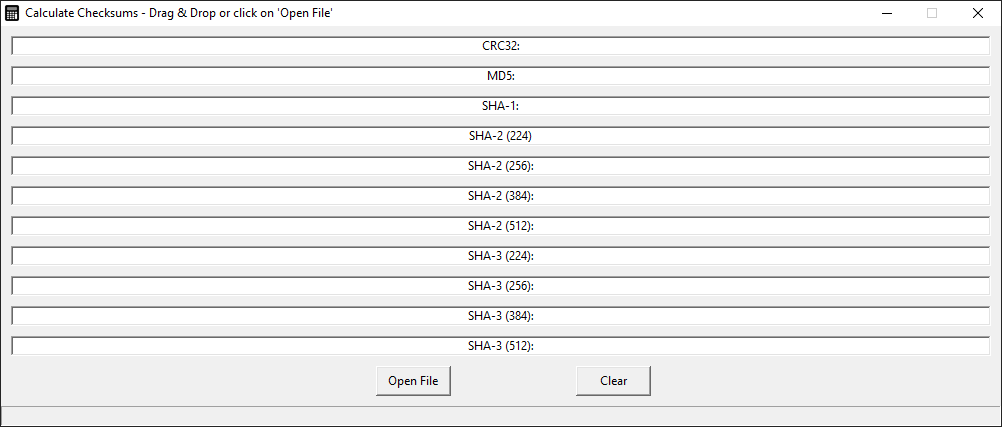 Small Utility to calculate the CRC32, MD5, SHA1, SHA2, SHA2-512, SHA3, SHA3-512 of a file, click image to download